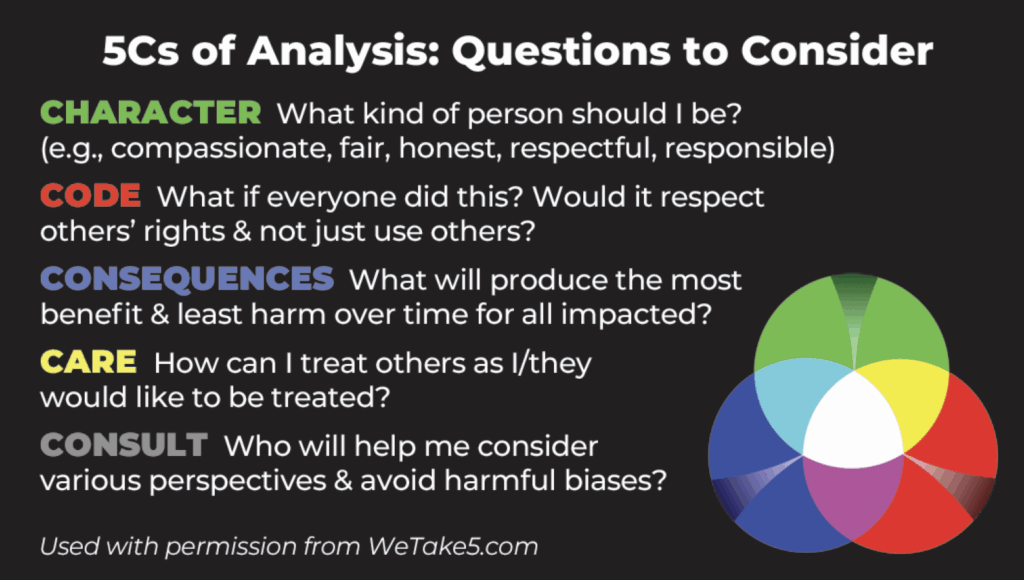 Are you aware of the impact of your decisions on both yourself and others? Are you aware of how you, and others, typically approach decisions about what is right? It is important to recognize that many of our decisions have an ethical component. Not just very large or complex dilemmas like the death penalty or euthanasia, but also daily decisions such as “Should I be honest about my friend’s terrible new haircut the day before their big interview?”, “What should I recycle?”, “Should I get up and workout or sleep longer?”, “Should I steal a jet and fly to Indonesia for a hot stone massage?” As Prentice mentions: “Studies demonstrate that people are more likely to make poor ethical choices when they are barely aware that a decision has an ethical aspect.” Take5 each day to observe your emotions, gut reactions and thought processes. This will help you identify the ethical components of your decisions. See the Moral Awareness Video for more information about identifying ethical issues and the potential impact on all, in both the short and long-term. Note: as essential aspect of awareness is gathering facts.